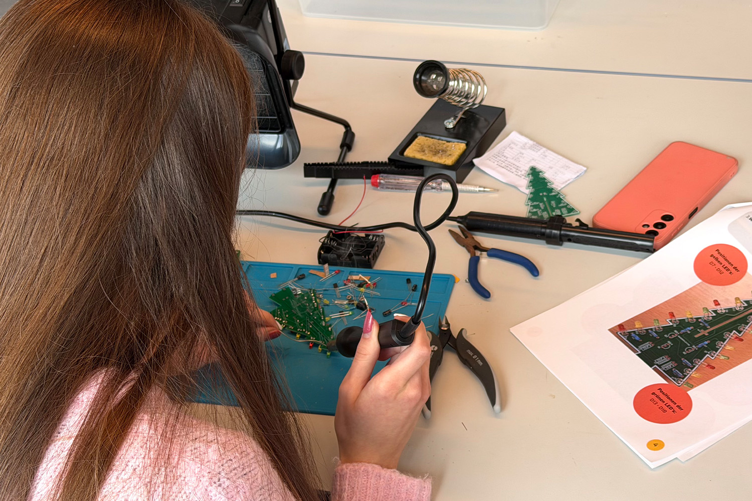 Weiter ging es für die Schülerinnen in die vorab gewählten Workshops. Kreativität und Technik verschmolzen im Medientechnik-Workshop „Generative Gestaltung“: Die Teilnehmerinnen erstellten in einer speziellen Software visuelle Effekte und Animationen, die später in einem 360°-Raum projiziert wurden – ein immersives Erlebnis. Im Bereich Bauingenieurwesen wurden die Schülerinnen zu Umweltanalytikerinnen: Sie untersuchten Wasserproben aus der Donau und diskutierten, wie Gewässer sauber bleiben können. Technik trifft Design: Die Teilnehmerinnen erforschten das Zusammenspiel von Funktionalität und Ästhetik im Produktdesign. Im „Achtsamkeit und Resilienz“ lernten die Schülerinnen interaktiv Strategien, um mit Erwartungen, Zukunftsangst und Entscheidungsdruck umzugehen und mehr Klarheit und Selbstvertrauen zu gewinnen. Die Welt der Codes und Verschlüsselung faszinierte die Teilnehmerinnen des Kryptographie-Workshops: Sie lernten, wie Informationen sicher übertragen werden und warum Kryptographie heute unverzichtbar ist. Eine weitere Gruppe widmete sich der Elektrotechnik: Sie löteten einen blinkenden Weihnachtsbaum und erhielten Einblicke in das Zusammenspiel technischer Bauteile wie Widerständen, Kondensatoren und Transistoren.