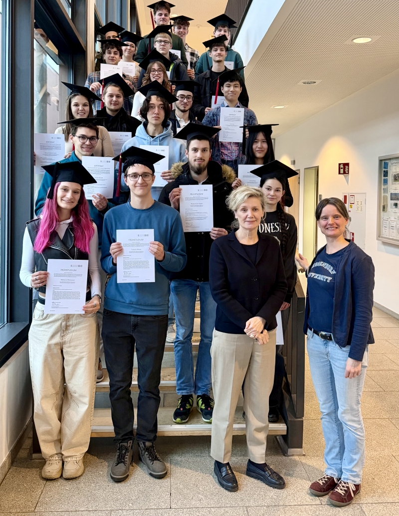 Bild (THD): Prof. Dr. Heigl-Murauer (unten, 3. v. l.) und Angelika Hable (unten r.) verabschiedeten feierlich die Frühstudierenden des Wintersemesters. Sie haben Schule und Studium an der THD gleichzeitig gemeistert.
