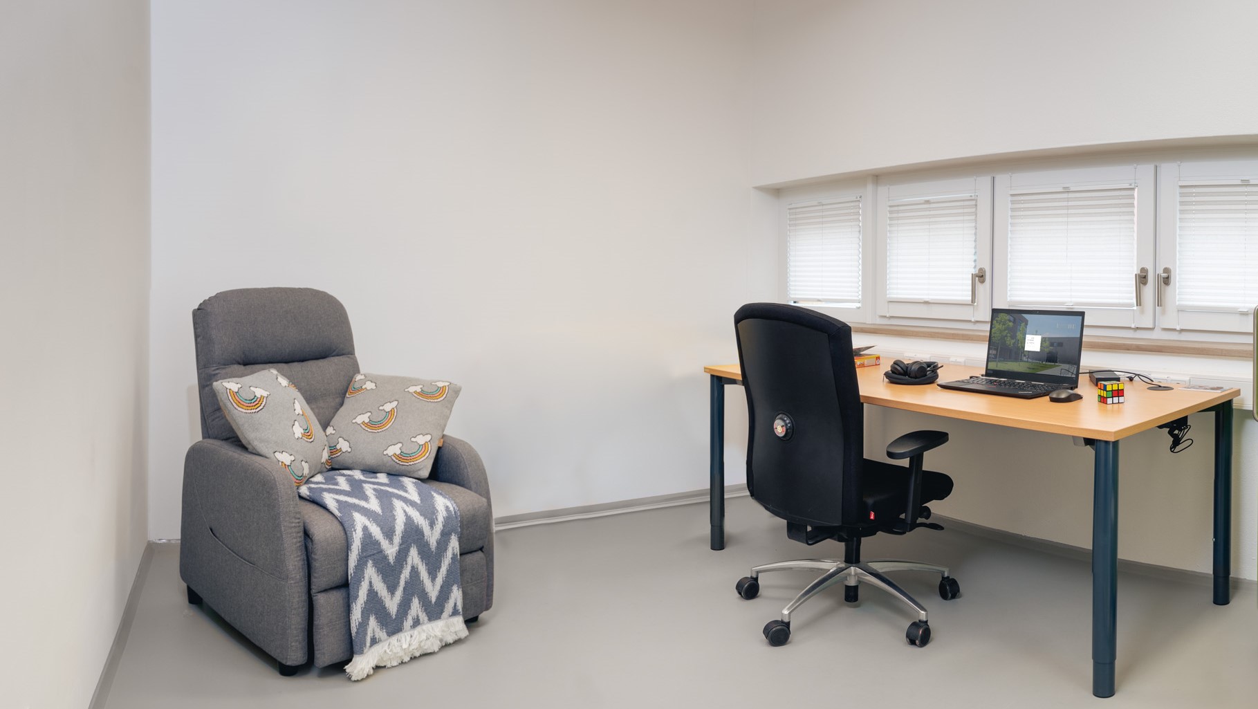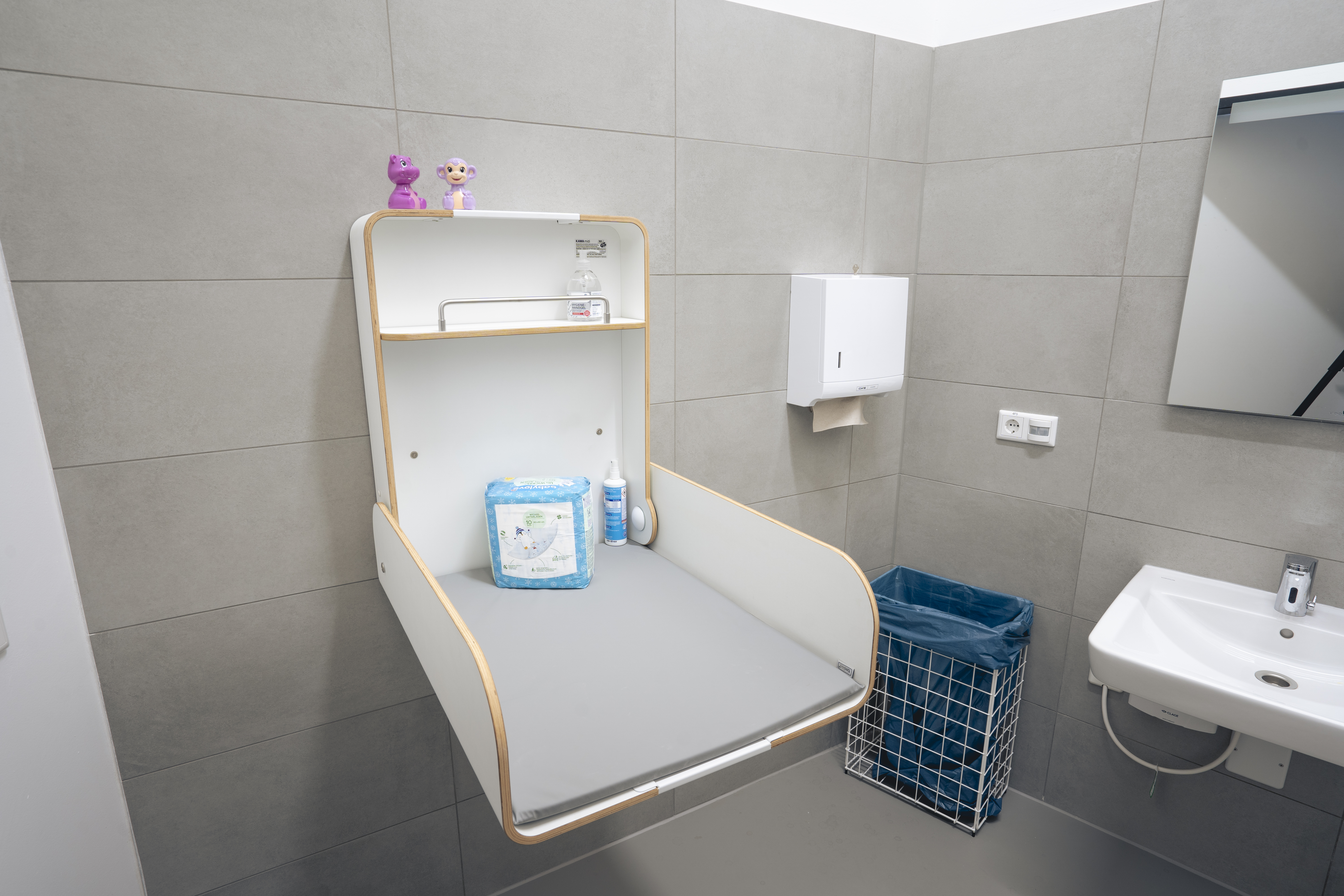 Zudem dient der Ruheraum auch als Eltern-mit-Kind-Büro, um bei Betreuungsengpässen trotzdem arbeiten bzw. studieren zu können. Es ist mit allen notwendigen Annehmlichkeiten ausgestattet, um den Bedürfnissen von Eltern gerecht zu werden. Für die Beschäftigung des Kindes steht die Kidsbox mit einer großen Auswahl von Spielen bereit. Zum Stillen ist ein bequemer Sessel vorhanden und im angrenzenden Sanitärbereich können Babys gewickelt werden.