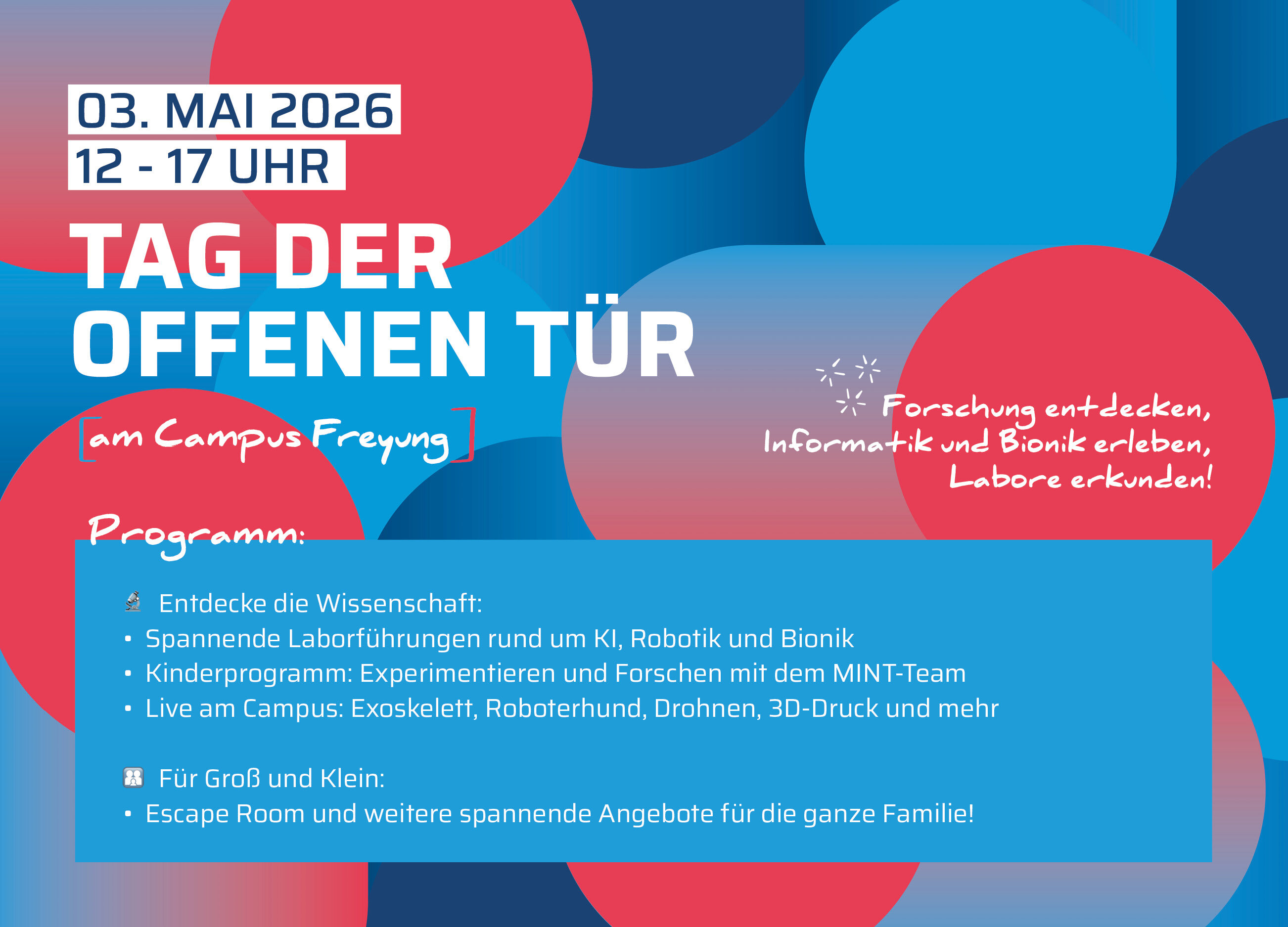 Ganz im Zeichen der Nachhaltigkeit durften die Gäste am Samstag verschiedene Techniken und Ansätze ressourceneffizienter Produktentwicklung im Maschinenbau kennenlernen. Circular Engineering verfolgt dabei ganzheitliche Ansätze, um einerseits Rohstoffe achtsam einzusetzen und zu recyceln und andererseits Maschinen und Geräte so zu fertigen, dass sie gut repariert werden können. In einem Quiz stellten die Besucherinnen und Besucher ihr Allgemeinwissen zu den Nachhaltigkeitszielen der Vereinten Nationen unter Beweis und durften anschließend einen 3D-gedruckten Roboter oder einen handbetriebenen Ventilator bauen.