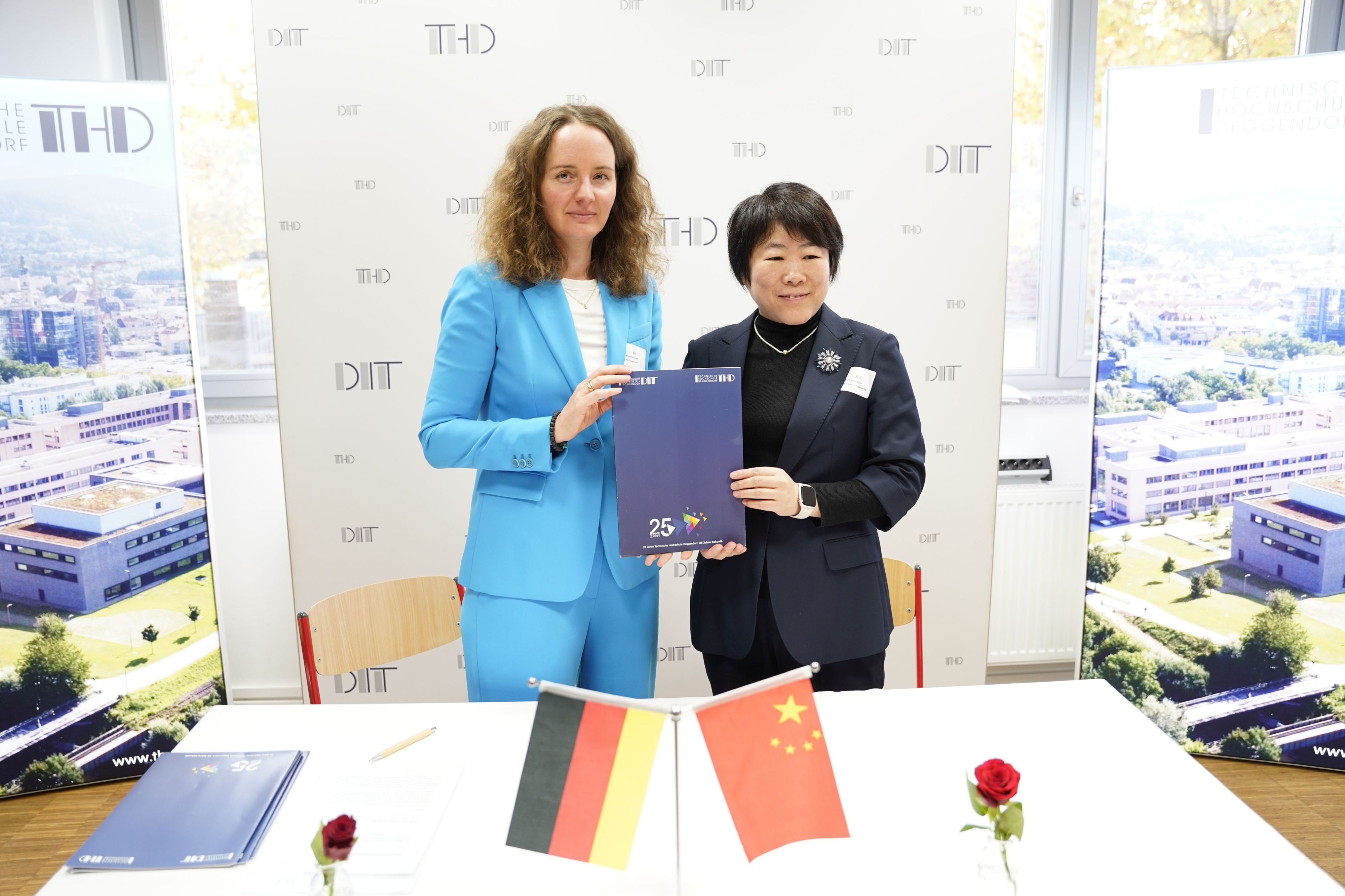 Bild (THD): THD-Vizepräsidentin Prof. Dr. Veronika Fetzer mit Hochschulpräsidentin Prof. Dr. Zeng Xiangjun.