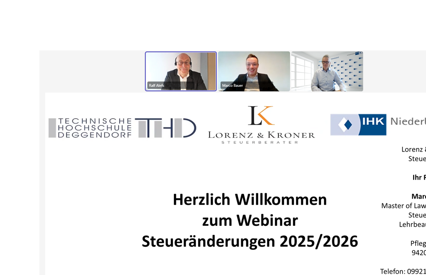 Bild (THD Fakultät AWW): Über 160 Teilnehmende begrüßten Steuerberater Prof. Dr. Ralf Alefs, Steuerberater Marco Bauer sowie Manuel Klement von der IHK Niederbayern (v. l.) zur virtuellen Steueränderungsveranstaltung.