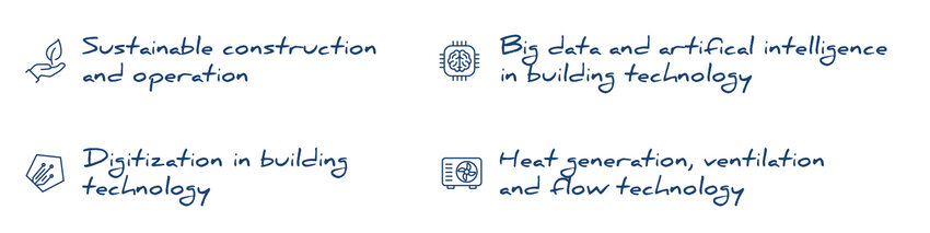 The focus is on innovative concepts for thermal energy generation and efficient air flow and air conditioning. Research ranges from heat pump technologies to fluid dynamics simulation of complex building systems.