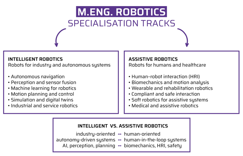 This postgraduate programme provides two different tracks to choose from: A) Intelligent Robotics and B) Assistive Robotics.The Master's degree programme in Robotics will be based on the content of the TC Intelligent Robotics and the requirements of regional companies and will include industrial and/or medical technology applications, for example. Graduates should be able to work in research and development, but also in industrial applications.