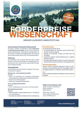 Die Gregor Louisoder Umweltstiftung vergibt jährlich Förderpreise an junge Wissenschaftler:innen, deren Master- oder Doktorarbeiten sich besonders für Umwelt- und Naturschutz einsetzen. Die Preise sind mit insgesamt 5.000 € dotiert und richten sich an Arbeiten mit Praxisbezug in verschiedenen Fachrichtungen.