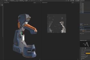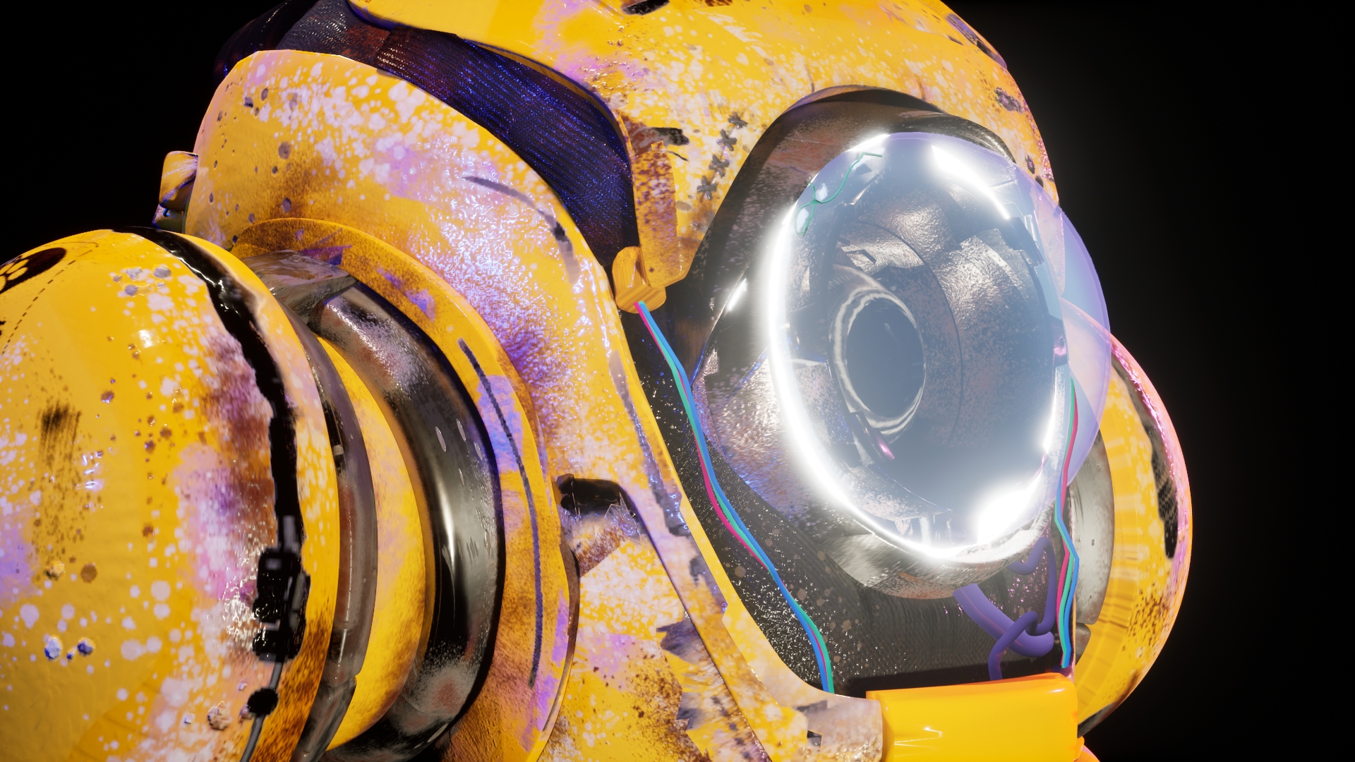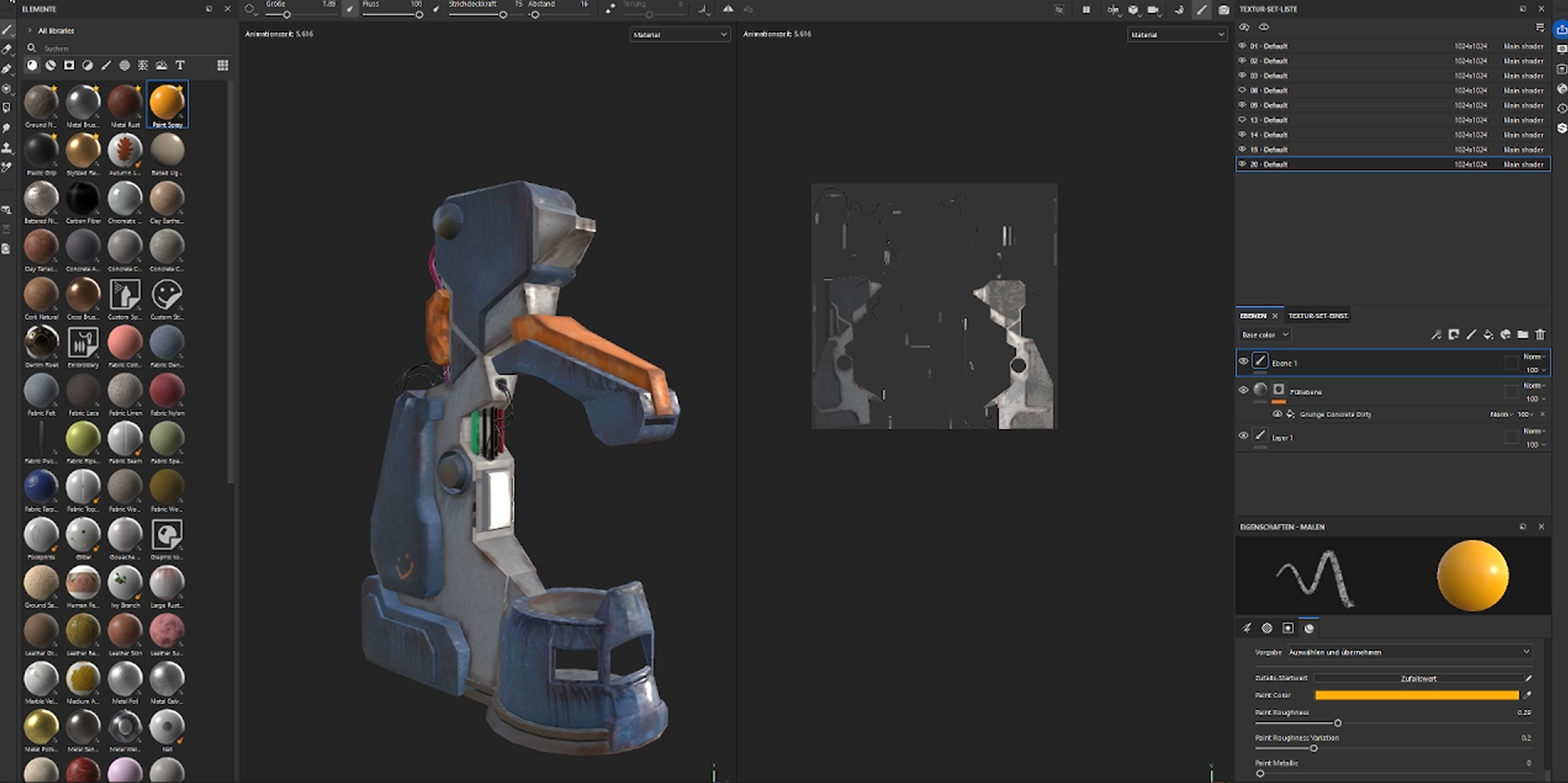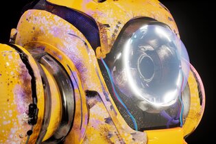 Für die Texturierung des Charakters wurden in 3ds Max saubere UV-Unwraps erstellt und die einzelnen Meshes anschließend in Adobe Substance Painter texturiert. Die erzeugten Texture Maps wurden in der Unreal Engine zu eigenen Materialien kombiniert und über Parameter weiter angepasst. So entstand ein visuell konsistenter Charakter aus abgenutztem Metall mit leuchtenden Elementen, der sich stilistisch in die Spielwelt einfügt.