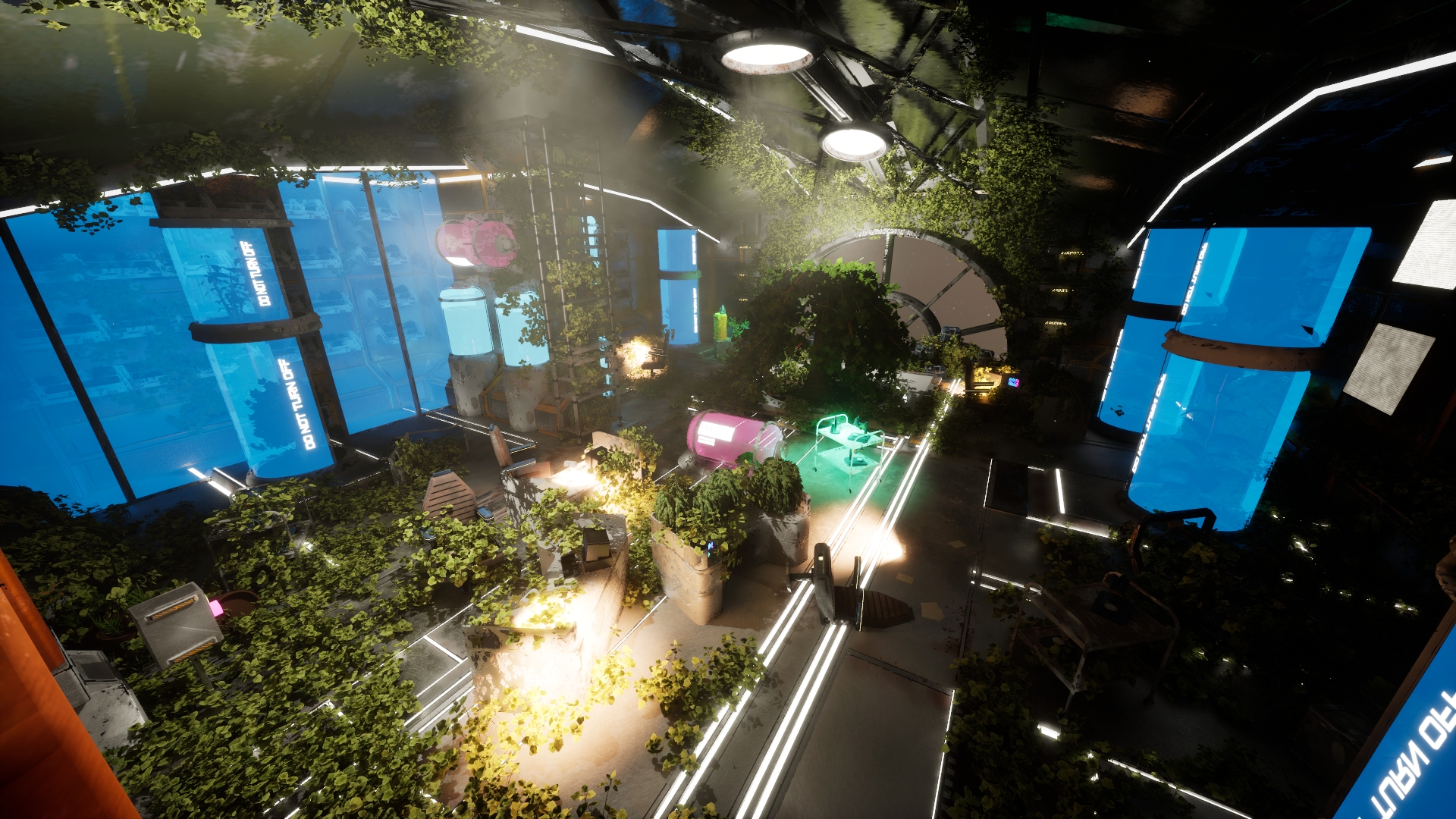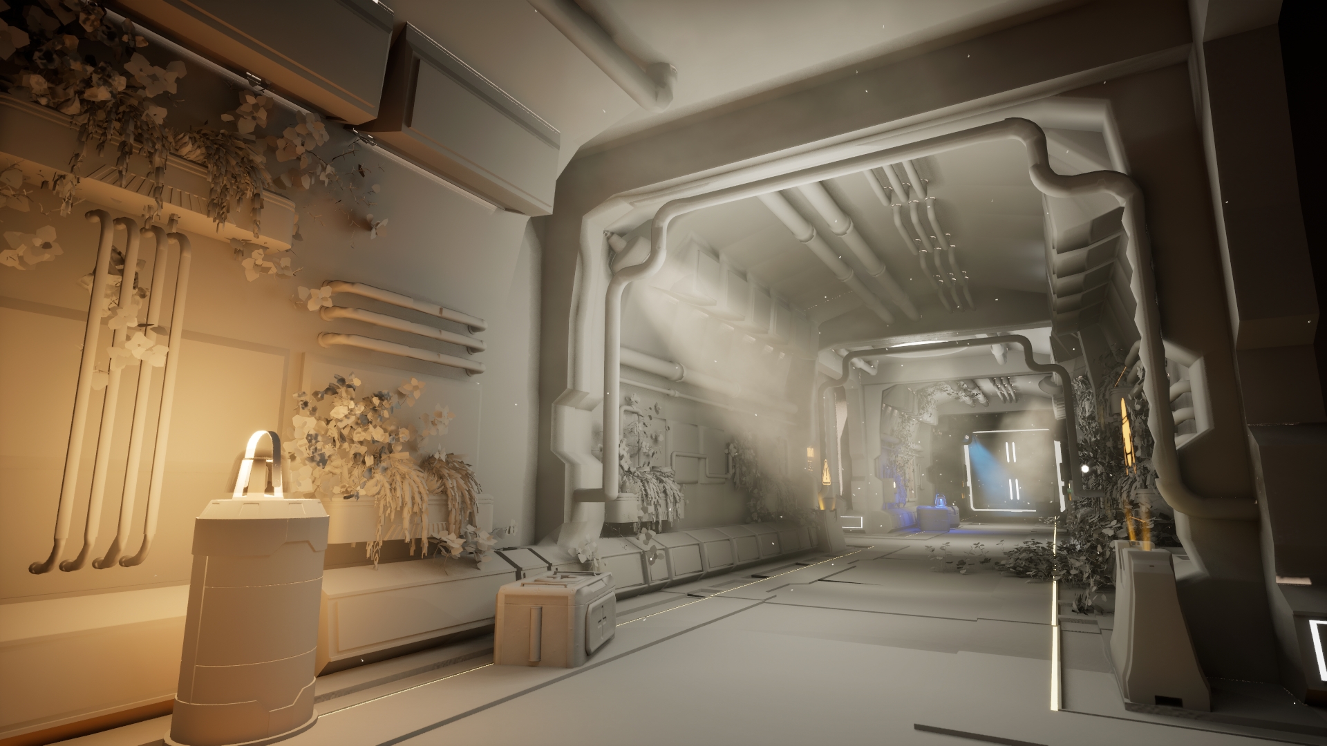 Auch das Environment des verlassenen Raumschiffs wurde vollständig neu erstellt. Der Aufbau der Spielwelt basiert auf modularen Assets, die einen flexiblen und iterativen Leveldesign Prozess ermöglichen. Die einzelnen Bereiche wie Promenade, Kontrollraum, Gewächshaus, Lagerräume und Roboter Ladestationen wurden von Grund auf in 3ds Max modelliert und anschließend texturiert. Durch die modulare Struktur konnte die Umgebung schrittweise erweitert und angepasst werden, ohne die visuelle Konsistenz der Spielwelt zu verlieren. Ziel war es, eine glaubwürdige, atmosphärische Umgebung zu schaffen, die die narrative Ausrichtung des Projekts unterstützt.
