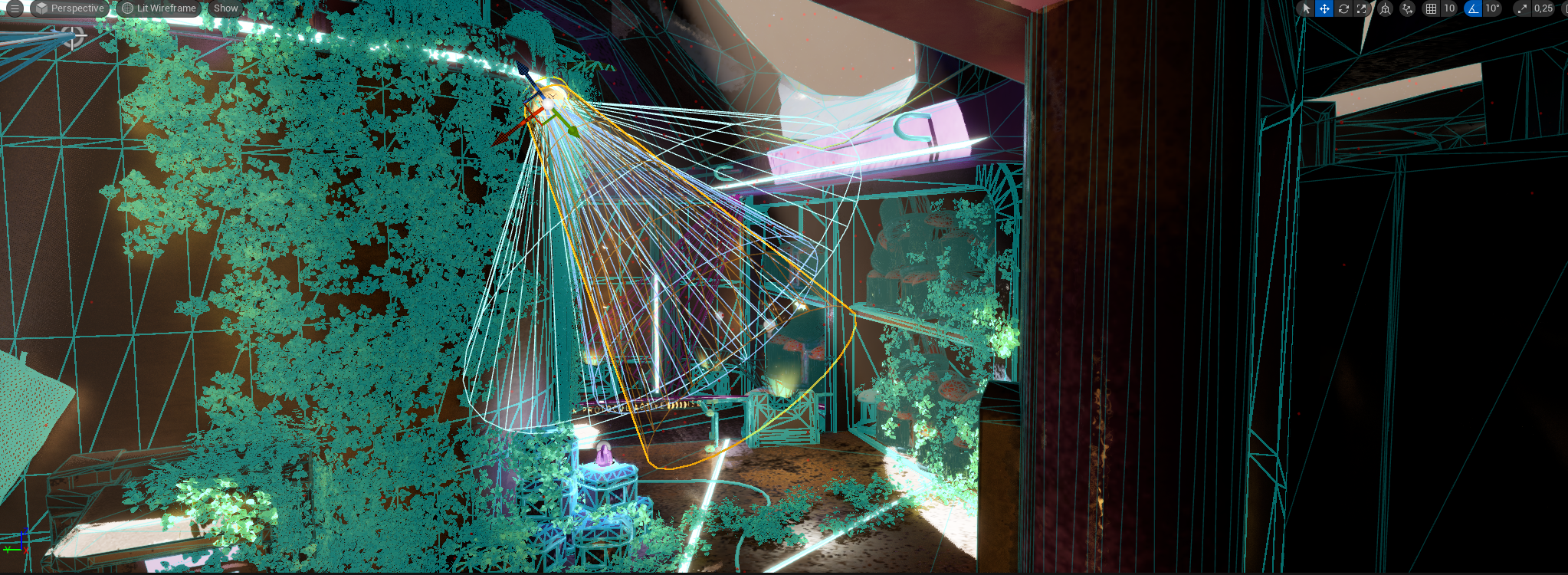 Interaktive Elemente innerhalb der Spielwelt wurden mithilfe von Blueprints realisiert und ermöglichen grundlegende Interaktionen wie das Öffnen von Türen oder die Nutzung von Aufzügen. Ein zentraler Schwerpunkt lag auf der Lichtsetzung, da Licht maßgeblich zur emotionalen Wirkung der Umgebung beiträgt. Gleichzeitig wurde auf Performance Optimierung geachtet, um eine stabile Darstellung auf Tablet Geräten zu gewährleisten. Hierzu kamen unter anderem Level of Detail Systeme, optimierte Materialien und moderne Unreal Engine Technologien zum Einsatz. Das Ergebnis ist ein spielbarer Walkthrough Prototyp, der Technik und Atmosphäre miteinander verbindet.