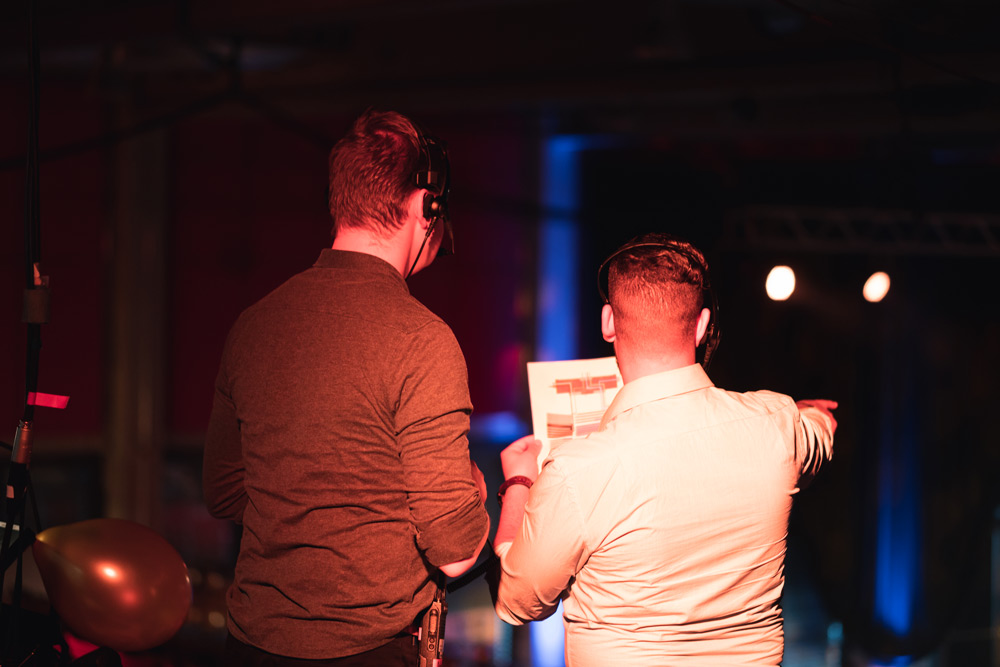 Die Umsetzung ist ein dynamischer und interaktiver Prozess. Die Studierenden treffen sich mindestens einmal pro Woche in einer Redaktionssitzung, um Ideen, Fortschritte, Probleme und ihre Lösungen zu diskutieren. Das Technikteam probt regelmäßig den Umgang mit der komplexen Studiotechnik, um diese bis zur Sendung sicher zu beherrschen. Sobald der Sendeplan steht, studiert das Technikteam die geplanten Abläufe ein, bis die einzelnen Gewerke wie ein Uhrwerk zusammenarbeiten. Der Reiz einer Live-Sendung liegt darin, dass trotz aller Vorbereitungen immer etwas Unvorhergesehenes passieren kann, auf das man spontan reagieren muss. Am Tag der Sendung ist es schließlich so weit. Die Generalprobe war fast perfekt, die Gäste sitzen in der Maske, die Moderator*innen haben Lampenfieber, das Publikum im vollbesetzten Medienatelier wartet gut gelaunt und erwartungsvoll auf den Moment, in dem um Punkt 18:00 Uhr das Licht erlischt und die Show beginnt.